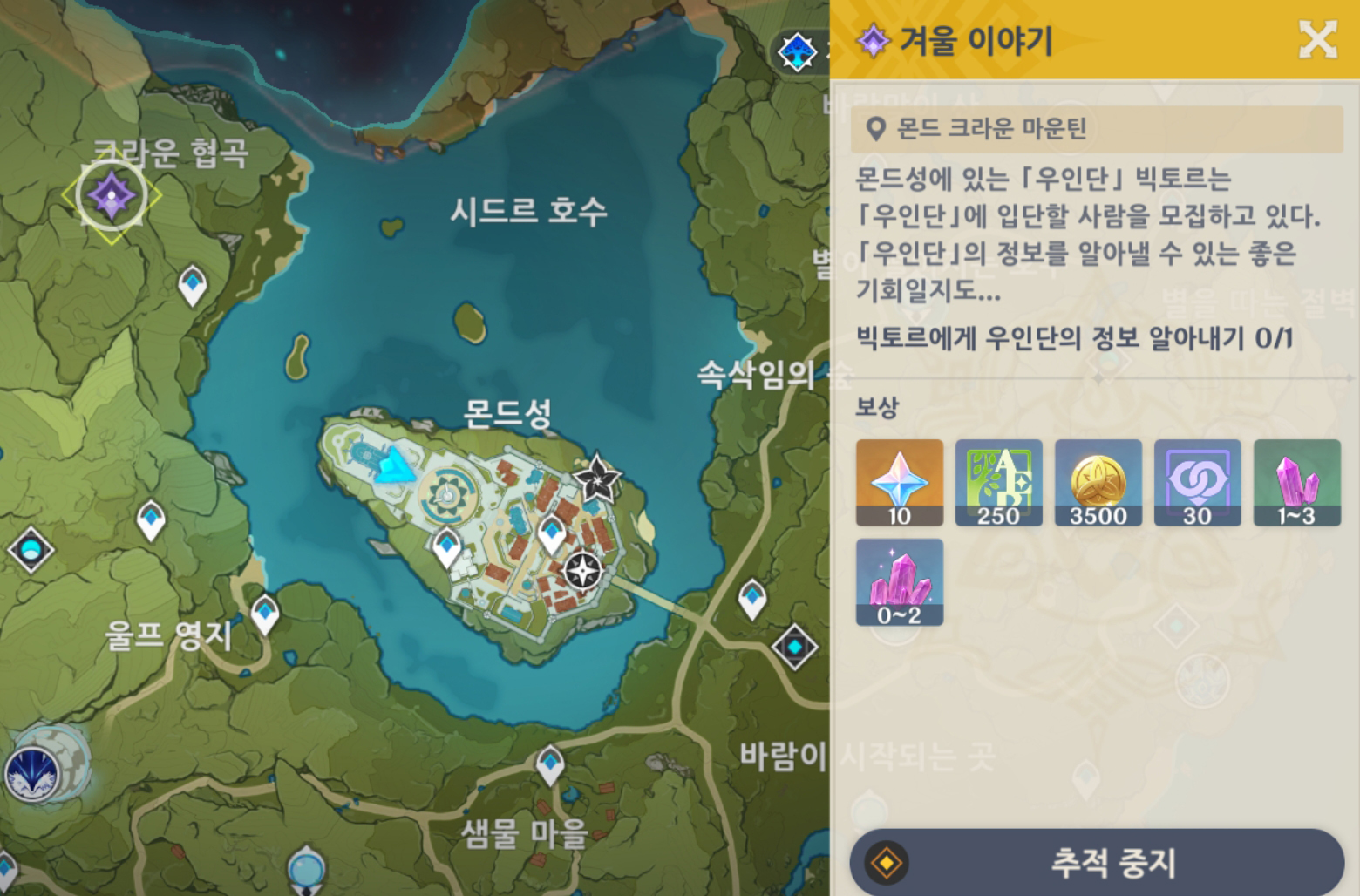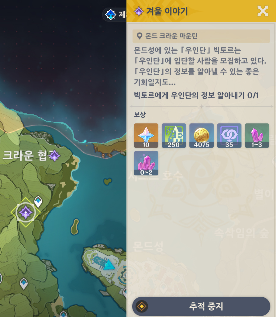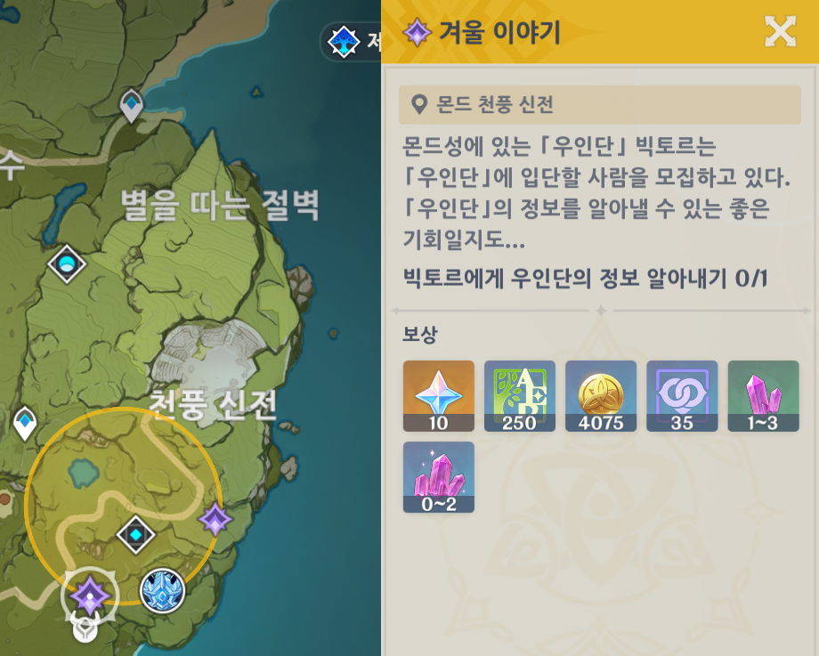'3가지의 선택지가 있다 = [있는 대로 말하기] 업적을 완료하려면 일일퀘스트로 겨울이야기가 3번은 나와야한다' 입니다.